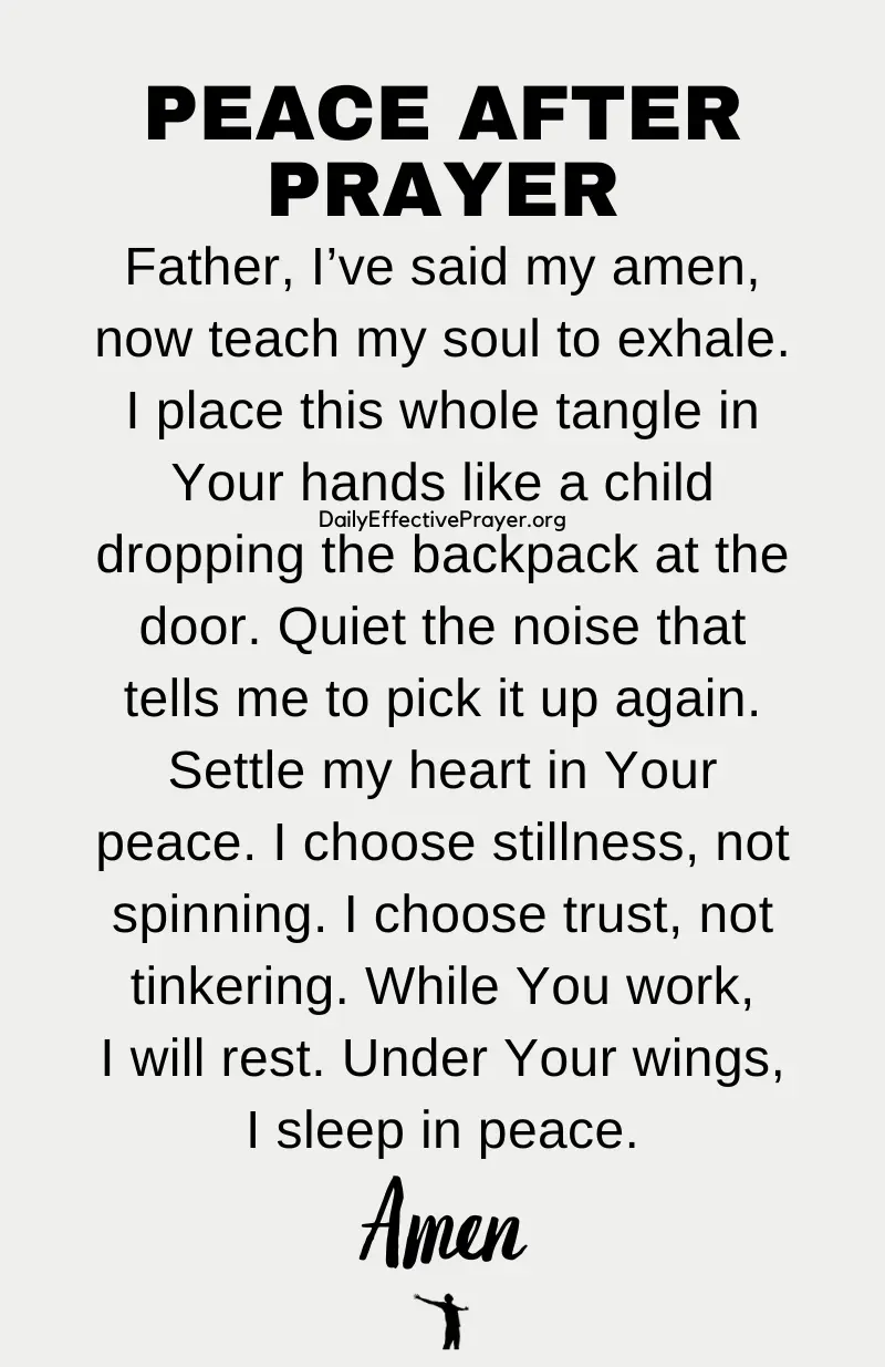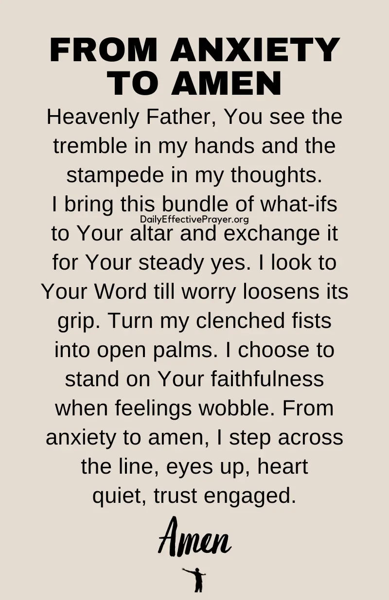 "Dear God, I come to You with my hands open and my shoulders dropping, letting go of the little fears that sneak in like sand in my shoes and wear me down by the mile. You remind me that You’re not just faithful in the big moments but steady in the small ones too, teaching my heart to trust You with everything instead of carrying pieces alone. When my thoughts start buzzing and my peace feels thin, pull me back into Your peace and help me trade anxious whispers for confident faith. Today I choose to rest in You, knowing You’re already handling what I keep trying to control. Amen."