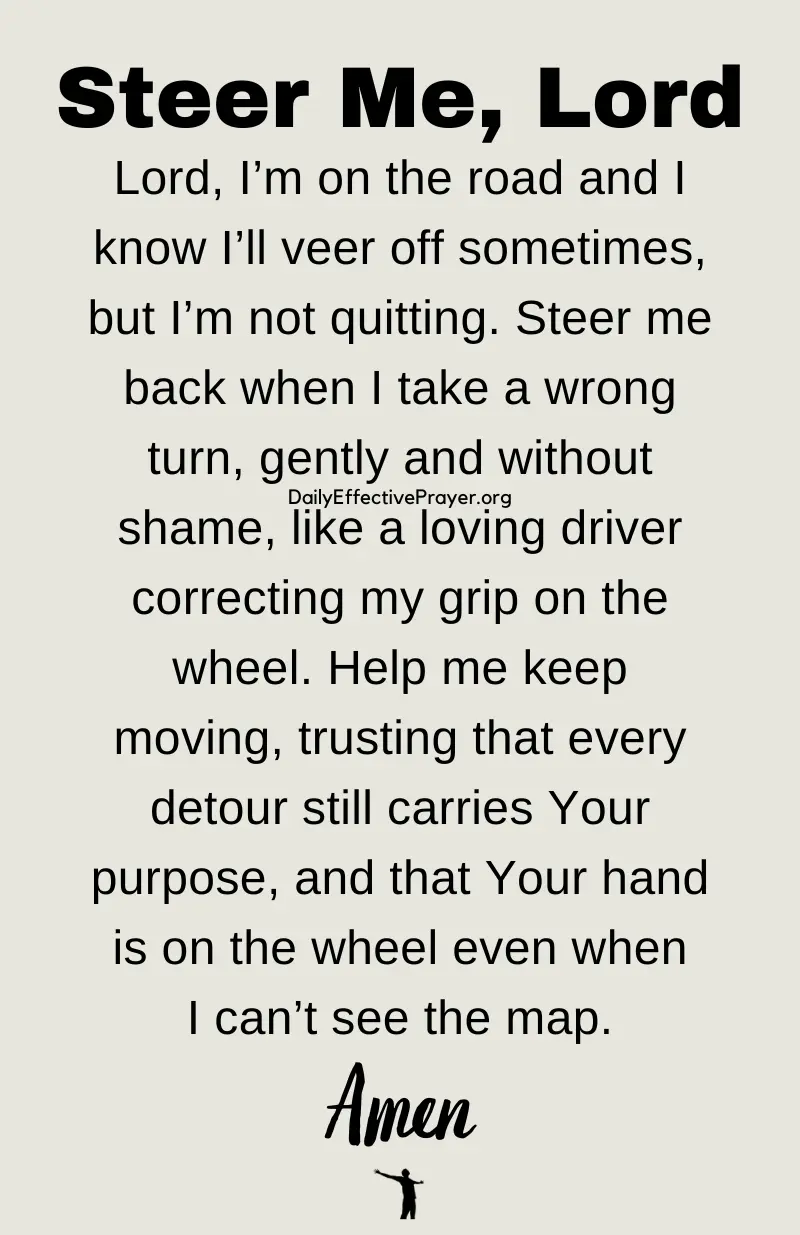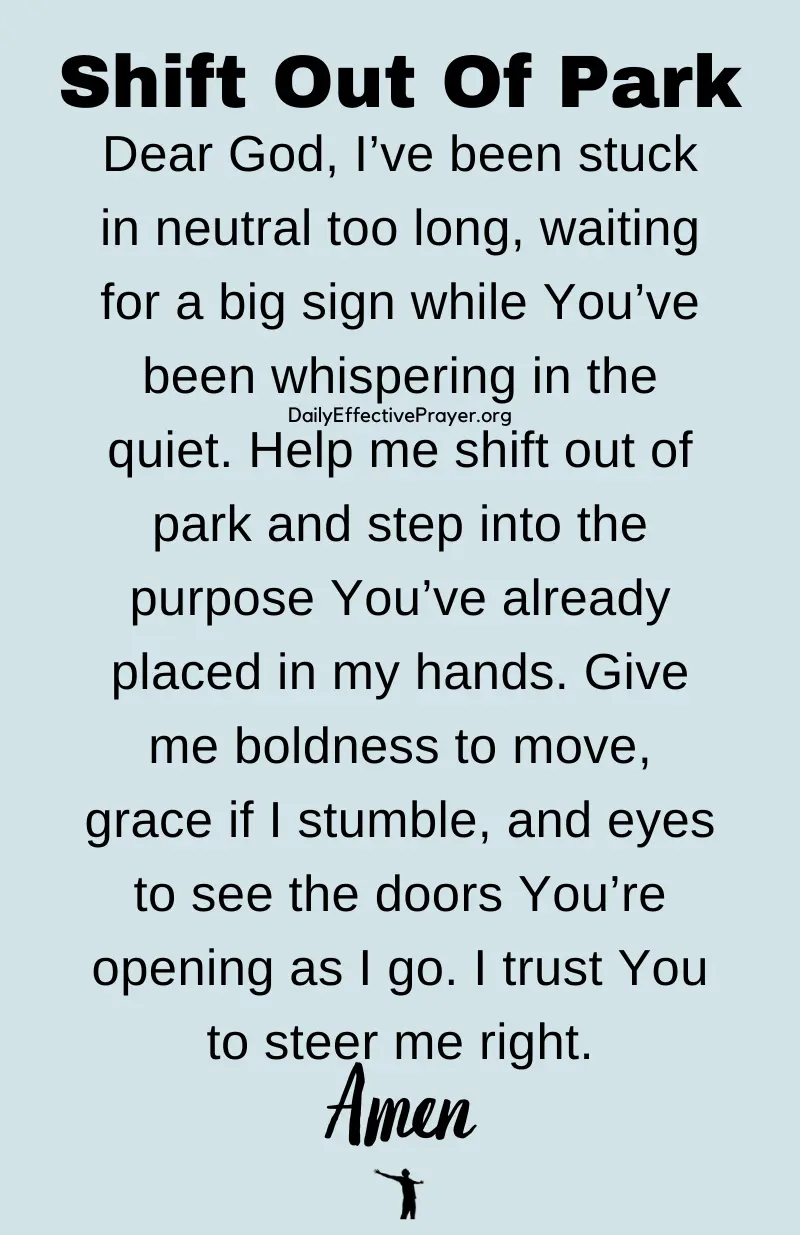 "Dear God, I admit I've spent too much time stuck in park, waiting for flashing signs from Heaven while missing Your gentle nudges. Help me get moving, trusting that even if I mess up, You're right there, ready to steer me back on course. I'm choosing today to shift into gear, knowing You'll guide every turn I take. So lead me, open the right doors, close the wrong ones, and keep me headed straight toward Your amazing plan for my life. Amen."
